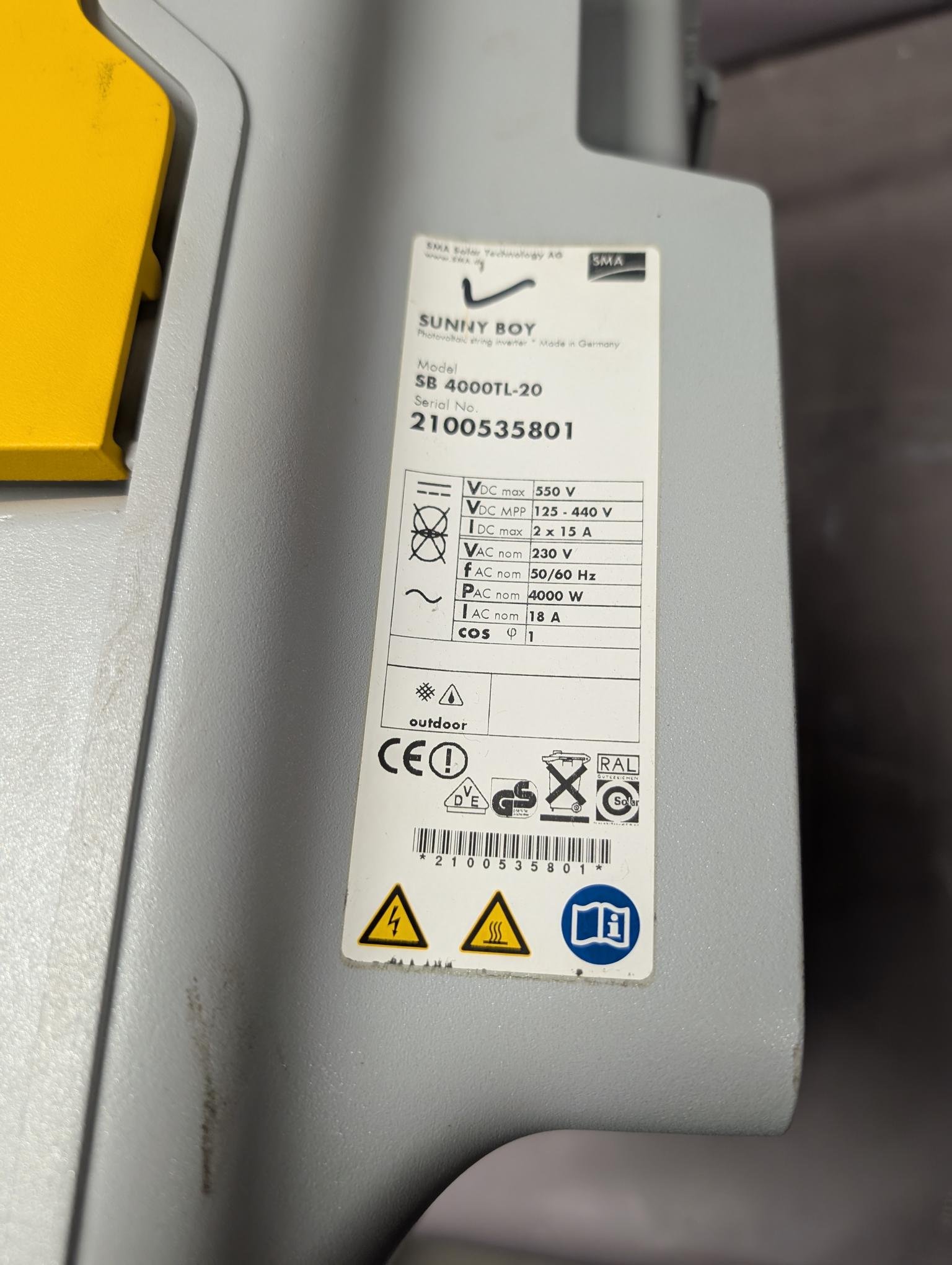 SMA Sunny Boy SB4000 TL‑20 – 4.0 kW Solar PV Inverter Yellow Cover