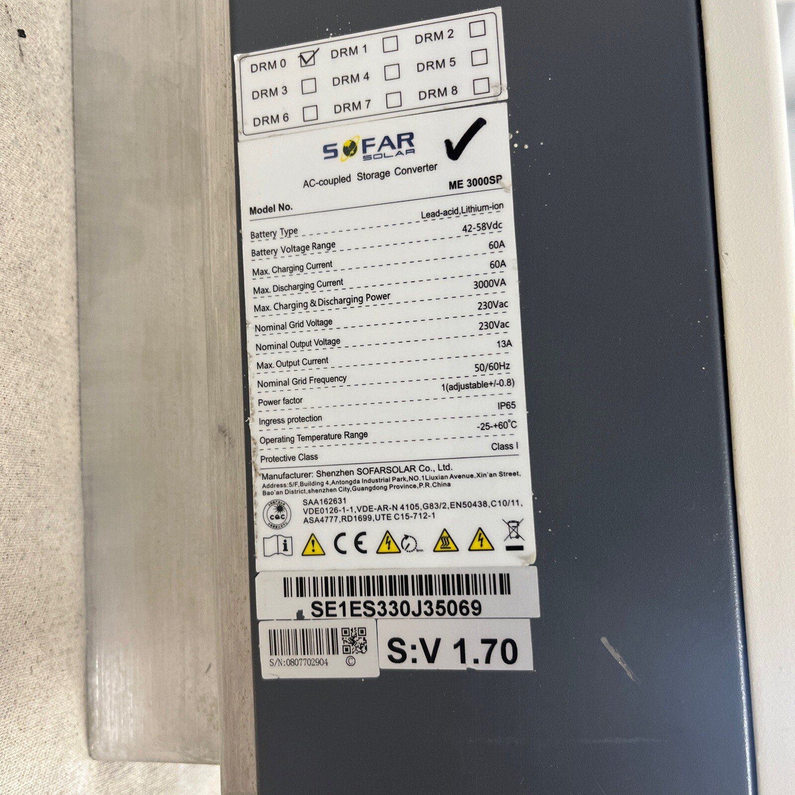 A fully tested Sofar Solar ME3000 AC‑coupled battery inverter, ideal for adding energy storage to an existing solar PV system or replacing a failed unit.